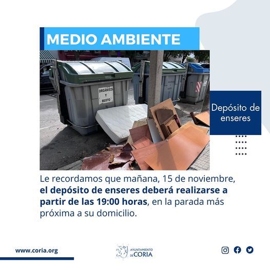 El Ayuntamiento de Coria ha emitido un recordatorio a los ciudadanos sobre las normas para el depósito de enseres en la vía pública. Según el comunicado, a partir del viernes 15 de noviembre, el depósito de muebles, colchones y otros enseres deberá realizarse únicamente a partir de las 19:00 horas en la parada de recogida más cercana al domicilio de cada vecino.