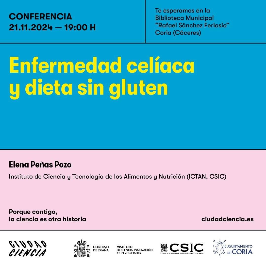 El próximo jueves, 21 de noviembre, la Biblioteca Municipal «Rafael Sánchez Ferlosio» de Coria será el escenario de una conferencia sobre la enfermedad celíaca y la dieta sin gluten, impartida por Elena Peñas Pozo, investigadora del Instituto de Ciencia y Tecnología de los Alimentos y Nutrición (ICTAN, CSIC).