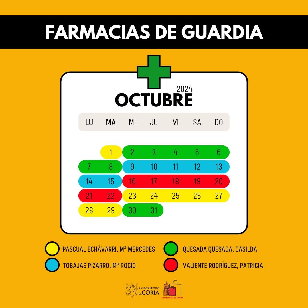 El Ayuntamiento de Coria ha publicado el calendario de farmacias de guardia para el mes de octubre. Los vecinos podrán consultar los turnos de las ... distintas farmacias disponibles durante todo el mes, facilitando así el acceso a los servicios farmacéuticos en cualquier momento.