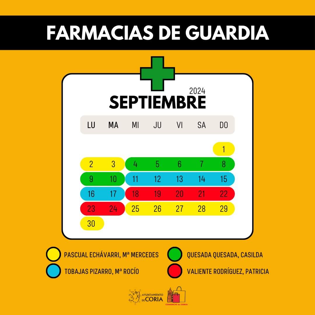 El Ayuntamiento de Coria ha publicado el calendario de farmacias de guardia para el mes de septiembre de 2024, facilitando a los ciudadanos el acceso ... a servicios farmacéuticos en días clave. A continuación, se detalla el reparto de las farmacias que prestarán servicio durante este mes: