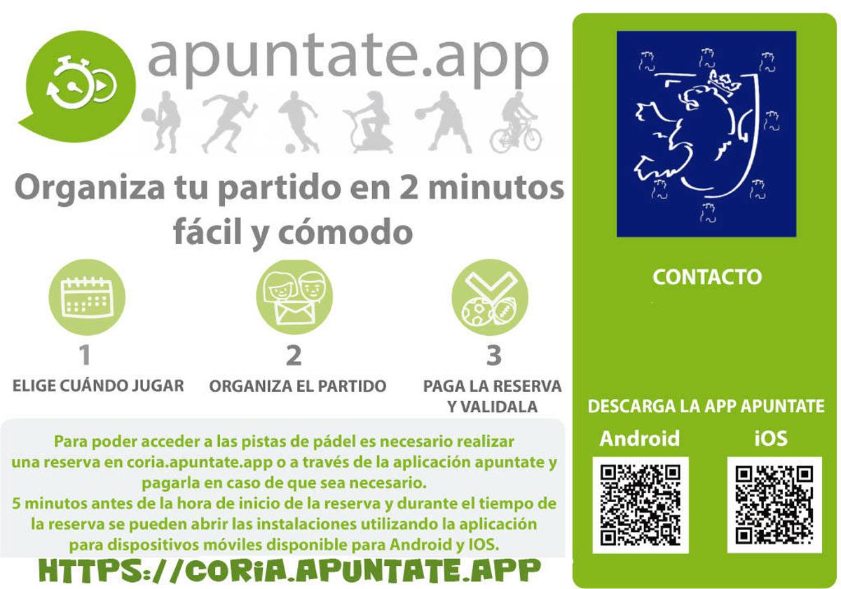 El acceso al portal de gestión de reservas de las instalaciones deportivas se realizará a través de https://coria.apuntate.app, también se podrá descargar la app desde tu plataforma para iOS y Android.