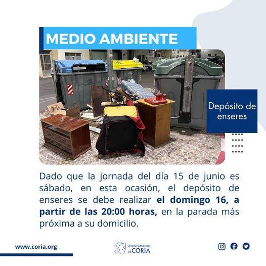 Debido a la jornada del sábado 15 de junio, el Ayuntamiento de Coria ha anunciado un cambio en el horario para el depósito de enseres, ... que tradicionalmente se realiza los sábados. En esta ocasión, se ha decidido que el depósito se llevará a cabo el domingo 16 de junio, a partir de las 20:00 horas.