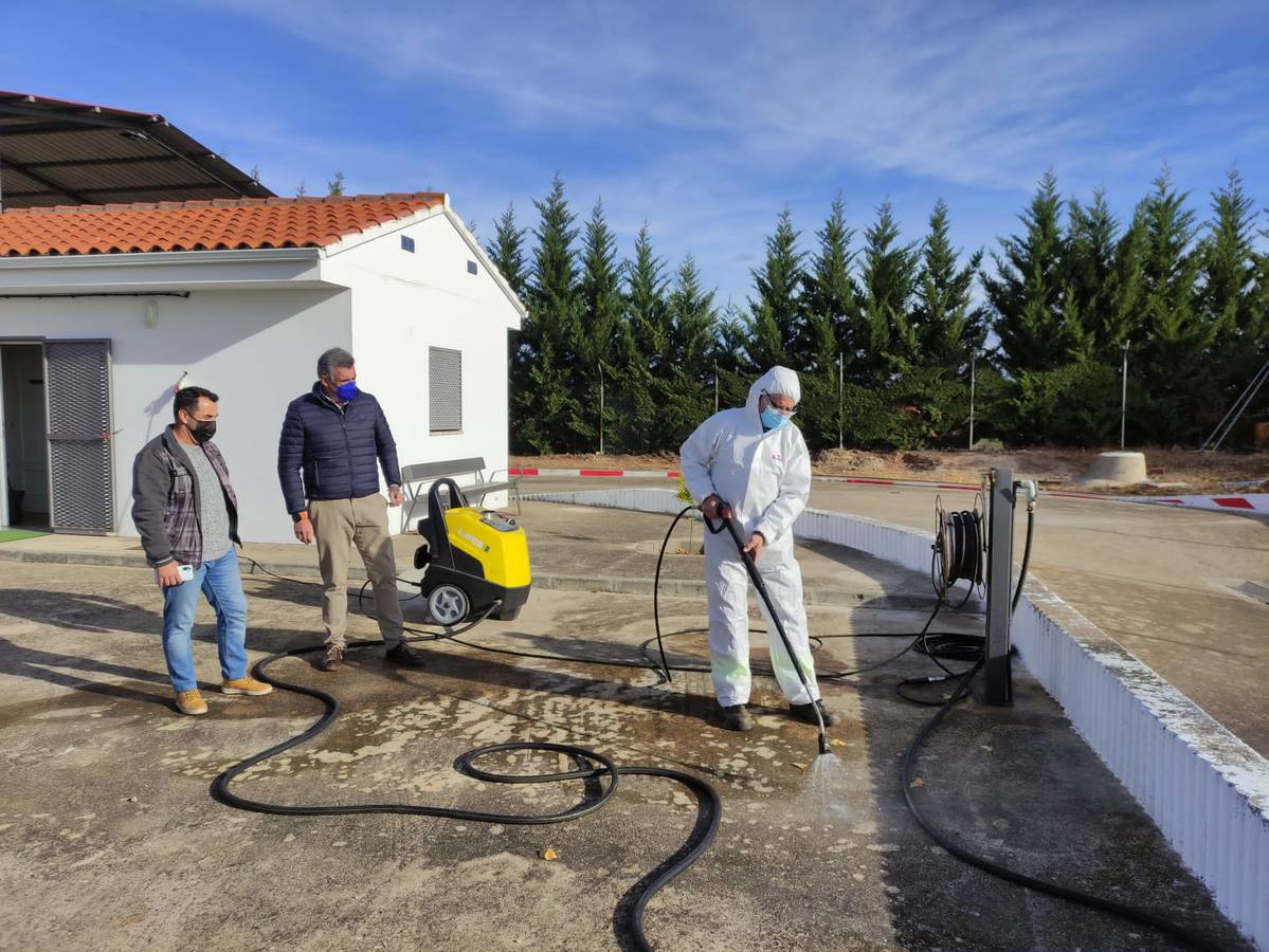 El alcalde de Coria, José Manuel García Ballestero, junto al concejal de Obras, Juan José Alcón, ha visitado las instalaciones del Centro de Desinfección de Vehículos, cuyo funcionamiento ha comenzado en el día de hoy.
