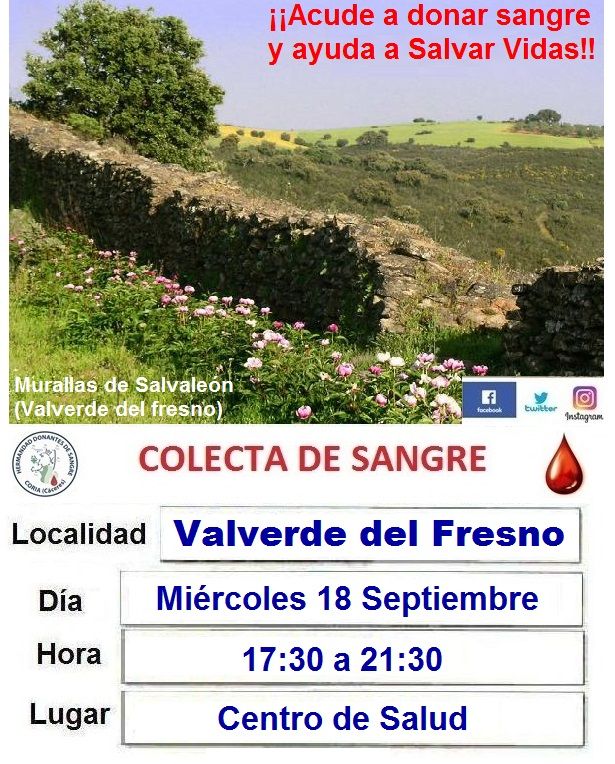 La Hermandad de Donantes de Sangre de Coria ha anunciado una nueva colecta de sangre que se celebrará el miércoles, 18 de octubre, en el ... Centro de Salud de Valverde del Fresno. El evento tendrá lugar de 17:30 a 21:30 horas y se hace un llamamiento urgente a todos los vecinos y residentes de la zona para colaborar con esta causa solidaria.