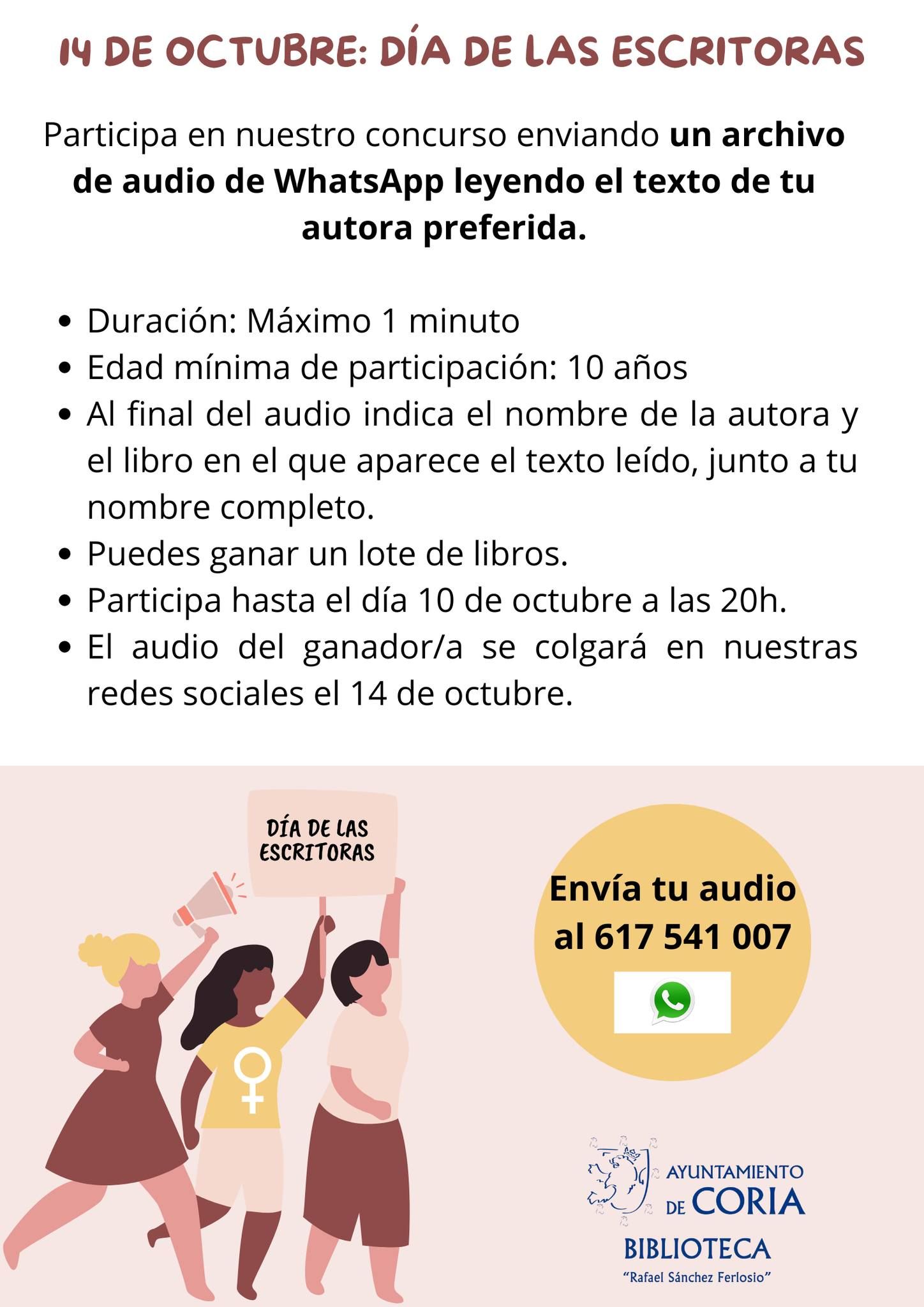 El Ayuntamiento de Coria, a través de su biblioteca municipal «Rafael Sánchez Ferlosio», ha lanzado un concurso especial con motivo del Día de las Escritoras, ... que se celebra el 14 de octubre. La iniciativa invita a la ciudadanía a participar enviando un archivo de audio vía WhatsApp en el que se lea un fragmento de su autora favorita.