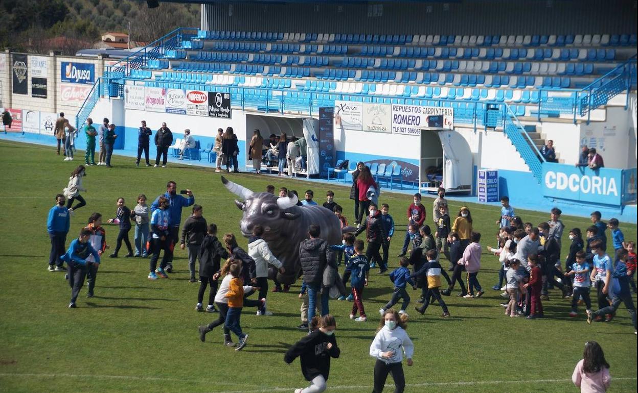 Tras el 1-2 del CD Coria frente al Panadería Pulido se celebraba en La Isla el 'Día del Niño', donde los aficionados más pequeños del Coria pudieron disfrutar de castillos flotantes y un encierro a su medida, con toros hinchables.