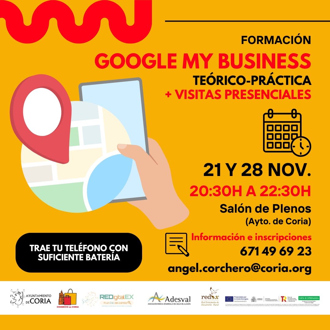 El Ayuntamiento de Coria ha puesto en marcha una formación teórico-práctica sobre Google My Business, dirigida a comercios y negocios locales interesados en mejorar su presencia online. La actividad, que se desarrollará en dos sesiones presenciales, tendrá lugar los días 21 y 28 de noviembre, de 20:30 a 22:30 horas, en el Salón de Plenos del consistorio.