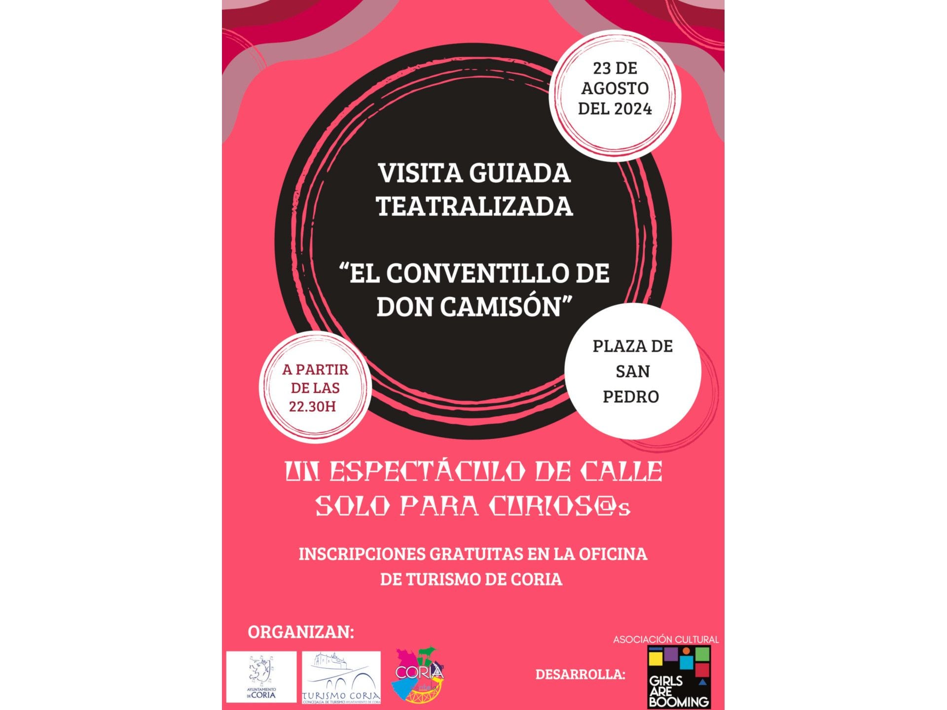 Hoy, 23 de agosto de 2024, Coria se prepara para una noche especial con la visita guiada teatralizada titulada «El Conventillo de Don Camisón». Este ... evento promete ser un espectáculo de calle único, diseñado para los más curiosos. La cita está programada para las 22:30 horas en la Plaza de San Pedro, un lugar emblemático de la ciudad.