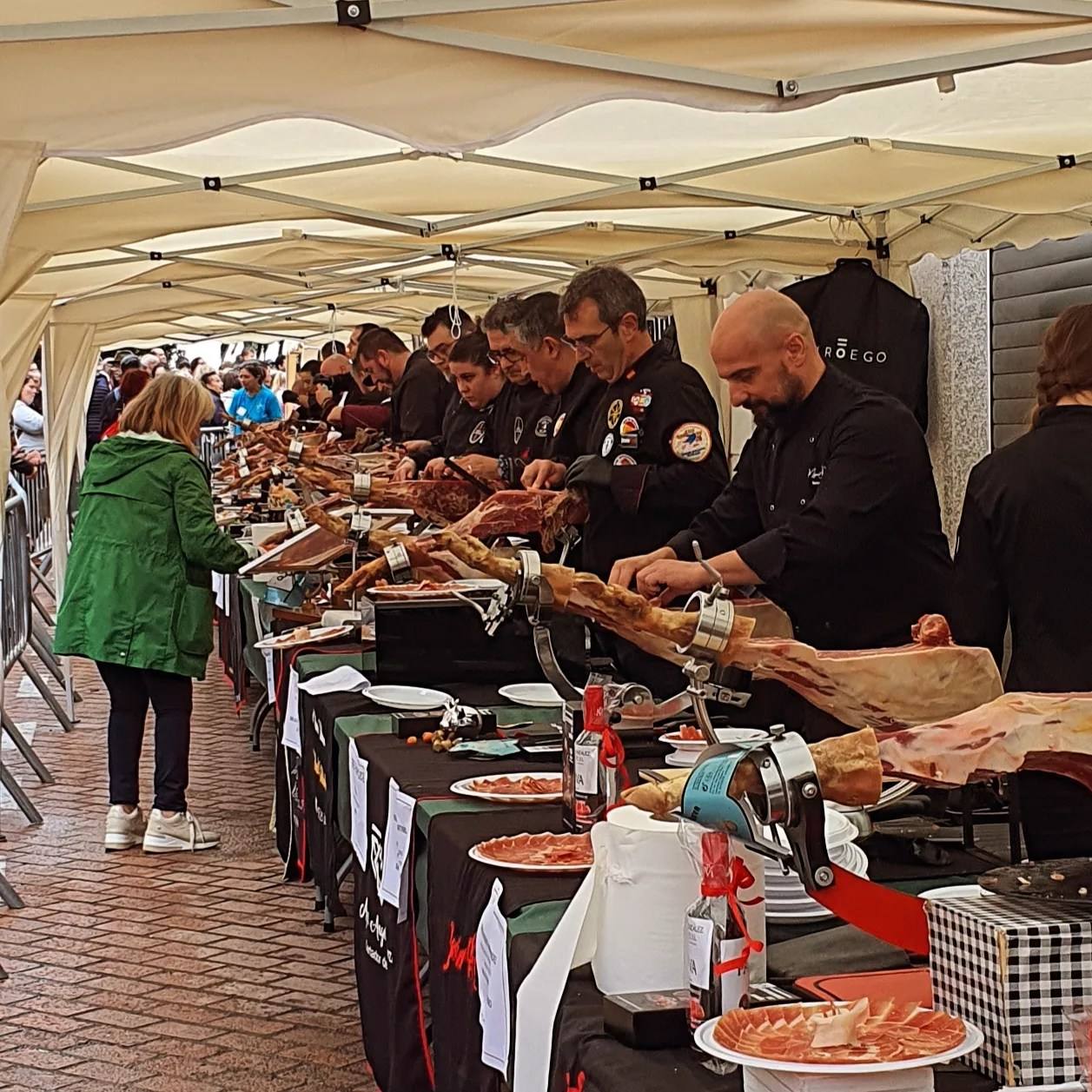 El Encuentro de Cortadores de Jamón que, por tercer año consecutivo se ha celebrado en Coria con un fin benéfico, ha reunido a más de 40 profesionales llegados de ciudades como Madrid, Huelva, Sevilla, Cáceres, Badajoz, Salamanca, Toledo, Ciudad Real, Albacete, Cuenca, Valladolid y Talavera de la Reina, además de Coria. Un evento que se ha celebrado el pasado domingo y que como ha señala Almudena Domingo, alcaldesa de la ciudad, «a pesar del mal día, ha sido un éxito el III Encuentro de cortadores de jamón benéfico, este año a favor de AXPAY».