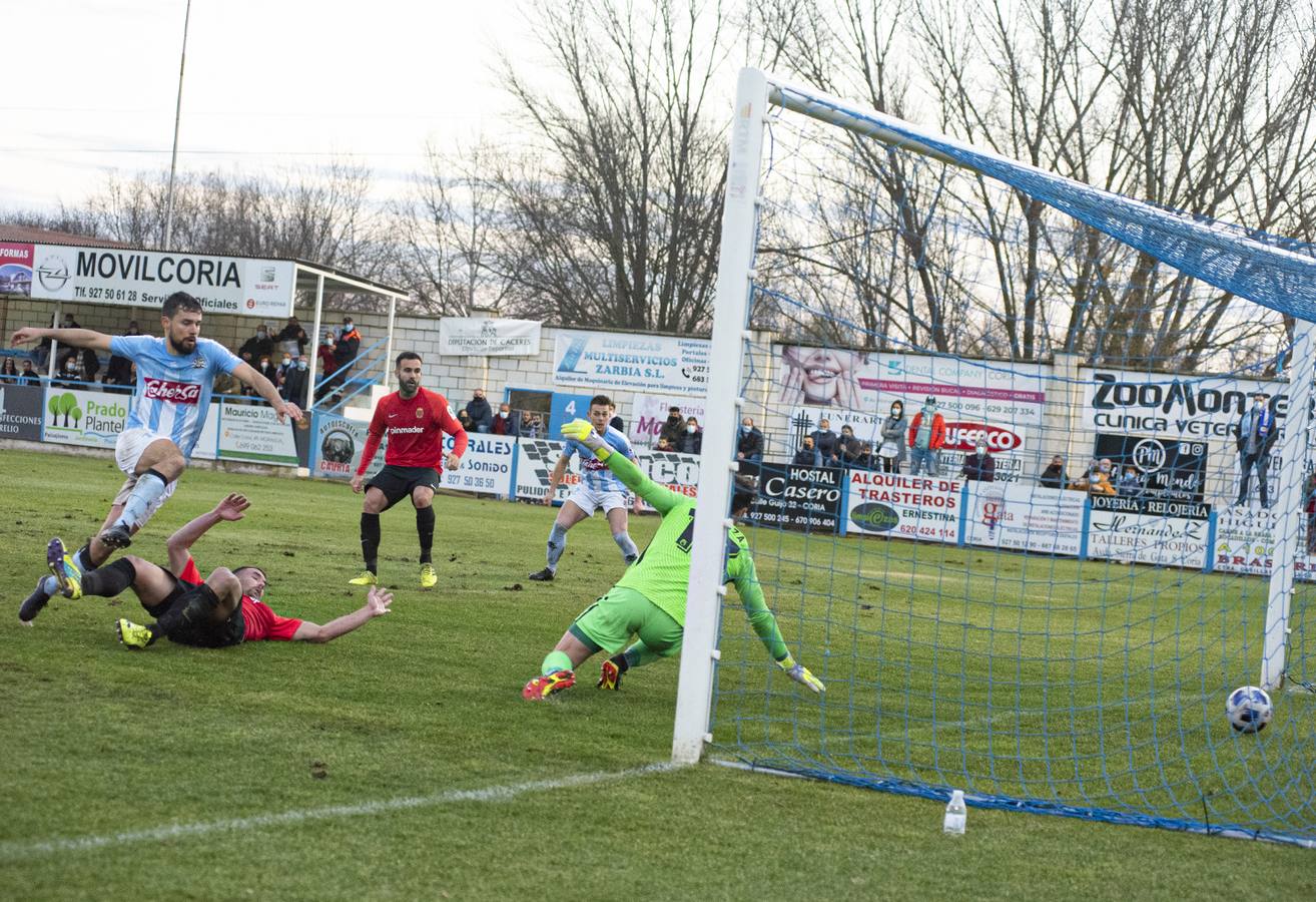 La segunda parte el Coria tuvo un gran lavado de cara realizando unos espléndidos 45 minutos y no dando tregua al Montijo que apenas disfrutó de ocasiones de gol, pasando inadvertido el portero local Álex, mientras que el arquero montijano Tienza se erigió en el mejor hombre de su equipo. El único gol del encuentro llegó en el minuto 48 tras una buena combinación del Coria con centro de Carlos García y un oportuno Alejandro bate a Tienza ante el delirio de los aficionados celestes. En el minuto 63 internada de David López por banda izquierda y Tienza evita el gol en disparo de Iván. De nuevo en el minuto 79 tras una buena combinación del Coria el disparo de Chema se marcha a córner. Con un Coria repleto de moral y seguro de sí mismo en el minuto 82 David López se escapa como una liebre por banda izquierda poniendo un pase perfecto sobre Antonio cuyo disparo en gran intervención lo envía Tienza a córner. En el 91 el Coria de nuevo a la carga y el portero montijano se luce en disparo de Antonio. Y Finalmente en el minuto 92 Lucas se va en solitario por banda derecha y su disparo salió lamiendo uno de los palos.