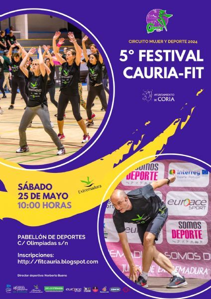 Desde el Departamento de Deportes del Ayuntamiento de Coria, informa sobre la apertura del plaza de inscripción del evento deportivo 5º Festival «Cauria Fit» 2024, que se encuentra enmarcado dentro del «Circuito Extremeño Mujer y Deporte», teniendo lugar el sábado 25 de mayo a partir de las 10:00h en el Pabellón Municipal de Deportes.
