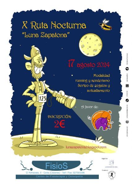 El Ayuntamiento de Coria, en colaboración con el Club «Zapatones Running», organiza la X Ruta Nocturna «Luna Zapatona». Este año, el precio de la inscripción ... es de 2 euros, cantidad que será destinada íntegramente a la Asociación Manutina, agrupación local en la que la protagonista es Manuela, una niña de dos años con una malformación congénita en el hemisferio derecho que le produce epilepsia. Esta asociación nace con el fin de ayudar a Manuela y a otros niños en situaciones similares, para poder costear los tratamientos y dar visibilidad a la enfermedad.