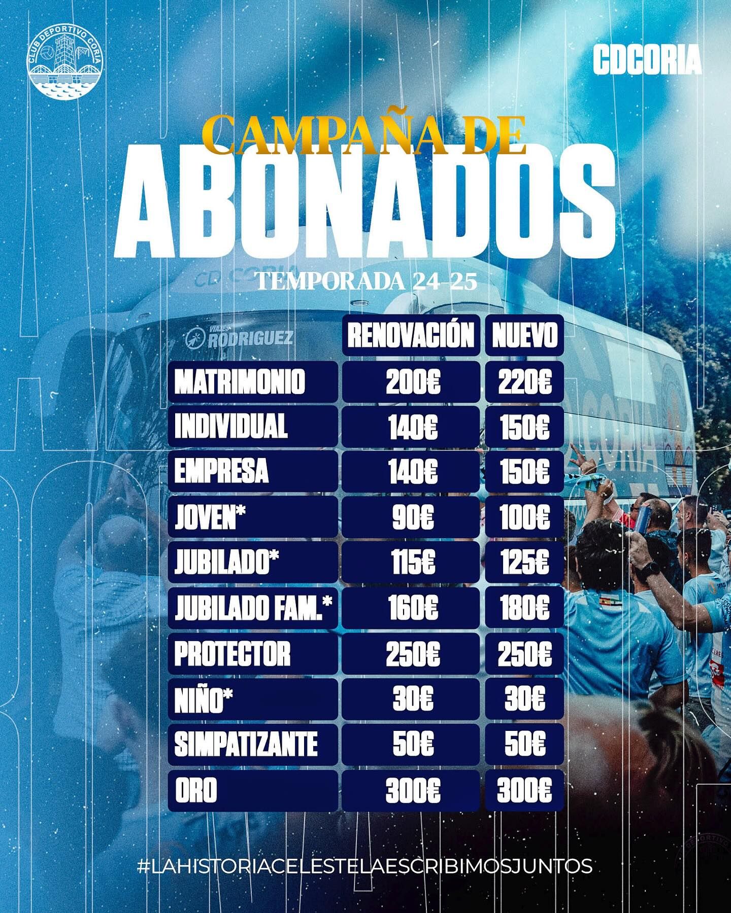 El club invita a todos sus seguidores a unirse a la familia celeste y ser parte de una temporada llena de retos y emociones. Con el lema «La historia celeste la escribimos juntos», el Club Deportivo Coria refuerza su compromiso con los aficionados, que son pieza fundamental en el camino hacia el éxito.