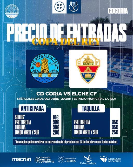 El CD Coria ha anunciado los precios y la información de la venta de entradas para el esperado encuentro de Copa del Rey frente al ... Elche CF, que se disputará el miércoles 30 de octubre a las 20:30 horas en el Estadio Municipal La Isla. Este enfrentamiento, que forma parte de la prestigiosa competición copera, ha generado gran expectativa entre los aficionados locales, que verán a su equipo enfrentarse a un rival de LaLiga 2.