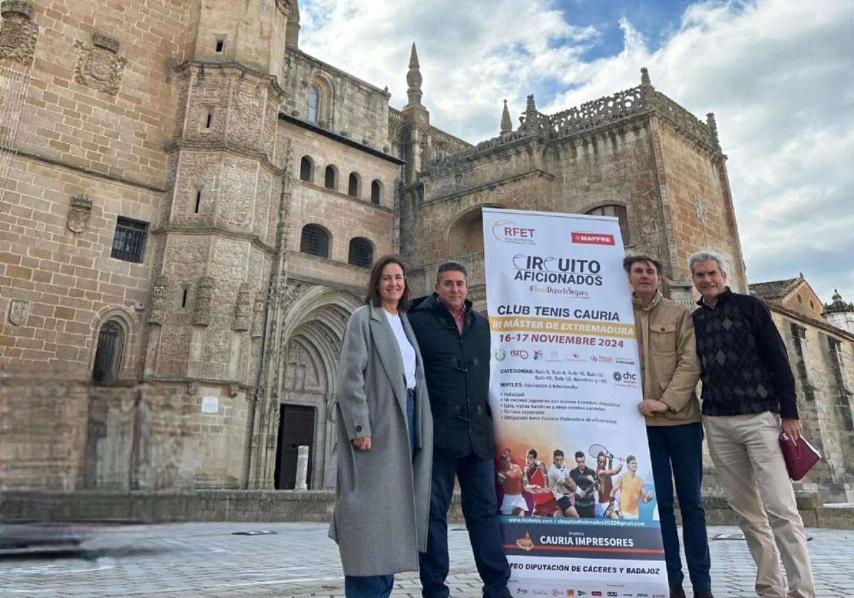 La Alcaldesa de Coria, Almudena Domingo Pirrongelli, acompañada del Concejal Delegado de Deportes, Juan Manuel Gutiérrez Rodríguez, junto al Presidente y Secretario del Club de Tenis Cauria, Roberto Jiménez Navarro y José Manuel Bueno Calle, han presentado esta mañana este máster final de tenis diseñado por la FEXT y avalado por la RFET que, por tercer año consecutivo, organizará y acogerá la sede de Coria a través del Club de Tenis Cauria poniendo el broche final a los diferentes Torneos del Campeonato del Circuito de Tenis para Aficionados 2024 disputados en tierras extremeñas dirigidos a jugadores aficionados de todas las edades, sexos y niveles, tanto de iniciación como intermedio, cuya final nacional se celebrará en una sede aún por determinar durante el puente de la Constitución.