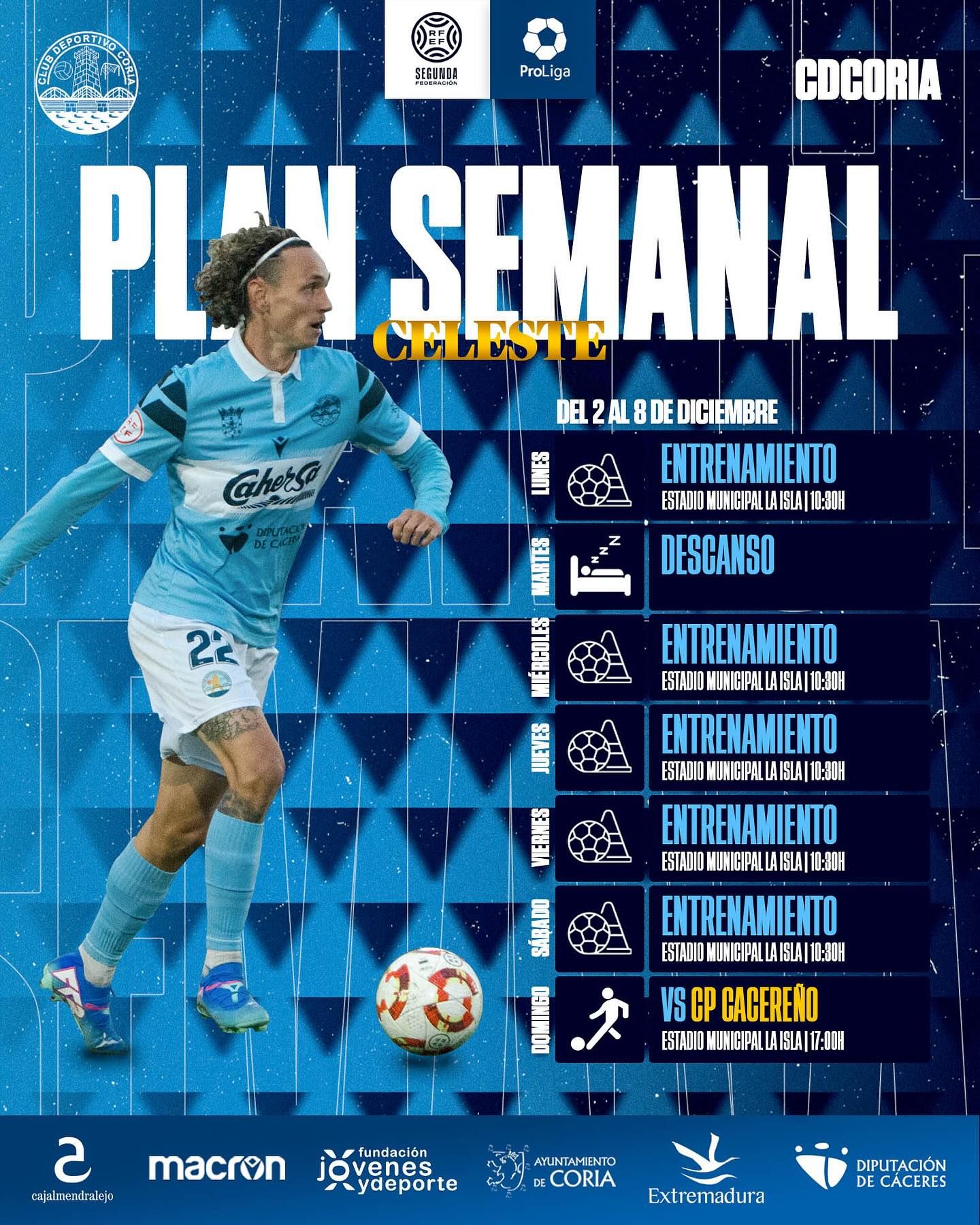 El Club Deportivo Coria ha publicado su planificación semanal de entrenamientos de cara al importante enfrentamiento contra el CP Cacereño, que se disputará el próximo ... domingo 8 de diciembre a las 17:00 horas en el Estadio Municipal La Isla.