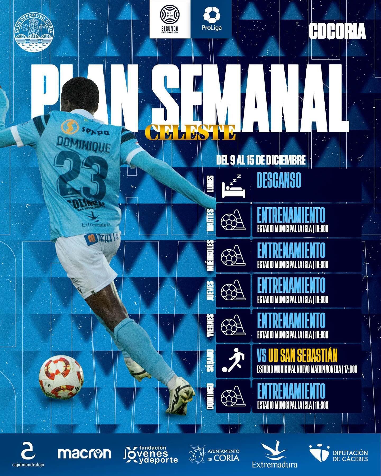 El Club Deportivo Coria ha presentado su plan semanal de entrenamientos, del 9 al 15 de diciembre, con vistas al importante duelo frente al UD ... San Sebastián, que se disputará el sábado a las 17:00 horas en el Estadio Municipal Nuevo Matapiñonera.