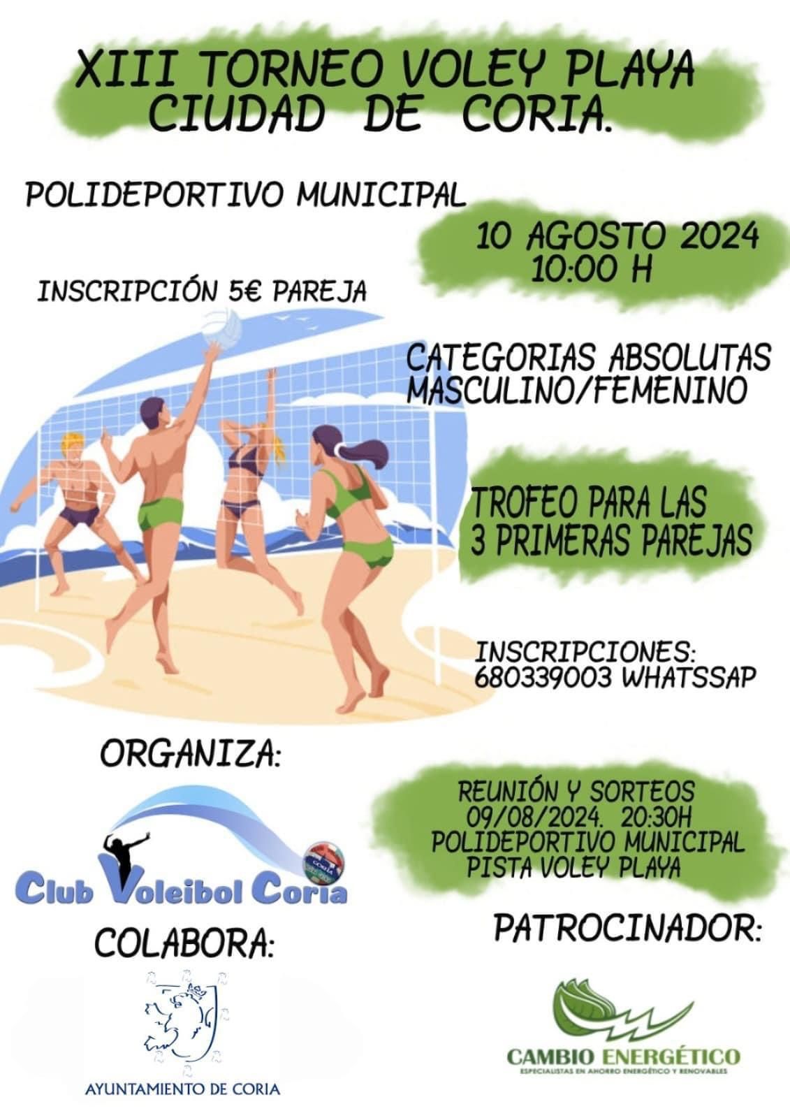 El próximo sábado 10 de agosto, Coria acogerá la XIII edición del Torneo de Vóley-Playa «Ciudad de Coria», uno de los eventos deportivos más ... esperados del verano en la región. Este torneo, dirigido a las categorías absolutas tanto femenina como masculina, se celebrará en la zona de la pista de juego del Polideportivo Municipal, situado en el Paseo de «La Isla».