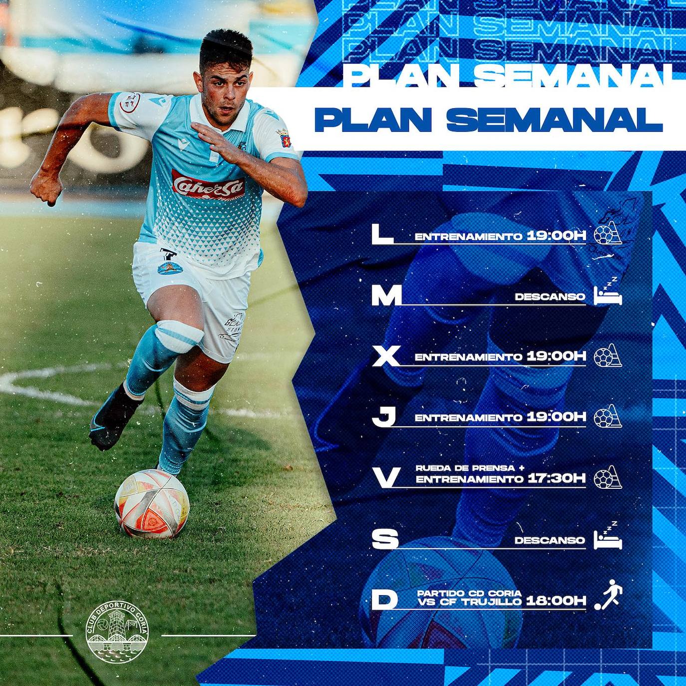 El CD Coria se enfrenta a una nueva semana llena de entrenamientos para seguir liderando la tabla clasificatoria una semana más. Lunes, miércoles y jueves tendrán entrenamientos a las 19:00 horas y viernes a las 17:30 horas.