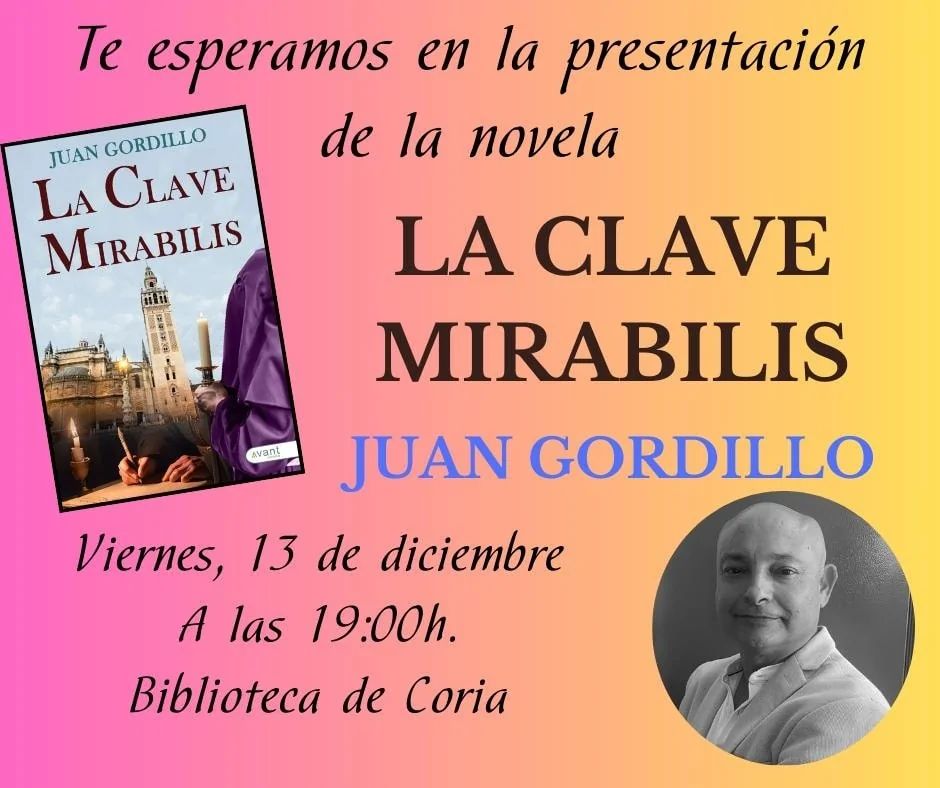 El próximo viernes, 13 de diciembre a las 19:00 horas, la Biblioteca de Coria será el escenario de la presentación de la novela La ... Clave Mirabilis, la más reciente obra del escritor Juan Gordillo.