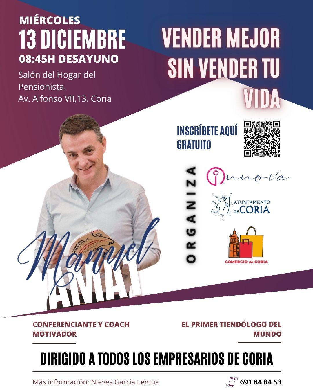 El Ayuntamiento de Coria, junto a la consultora Innova, ha organizado un desayuno con conferencia incluida que contará con la presencia del destacado experto en ... ventas, Manuel Amat. Esta sesión especial está programada para el día 13 de diciembre, a las 09:00 horas en el Hogar del Pensionista de Coria y está dirigida, principalmente, a profesionales y empresarios de la ciudad de Coria.