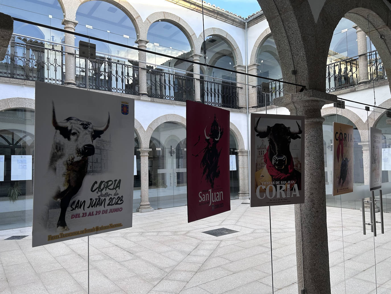 El patio de Cristal del Ayuntamiento de Coria acoge, hasta el próximo 15 de mayo, la exposición de carteles presentados al concurso de las Fiestas de San Juan 2023.