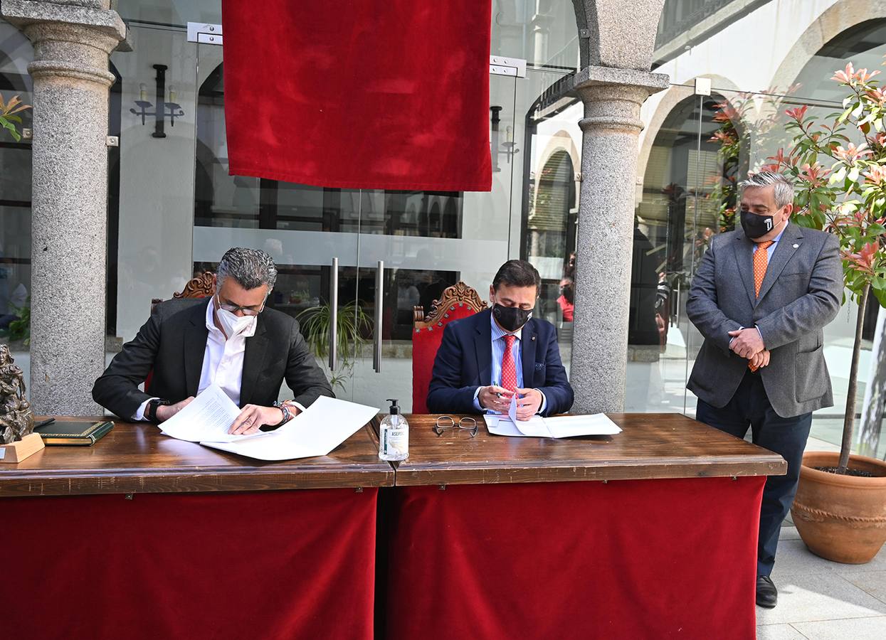 En el Patio de Cristal del Ayuntamiento de Coria tuvo lugar en la mañana de este miércoles, día 7 de abril, la firma del Convenio del Plan de Márketing Turístico entre la Universidad de Extremadura y el Ayuntamiento de Coria.
