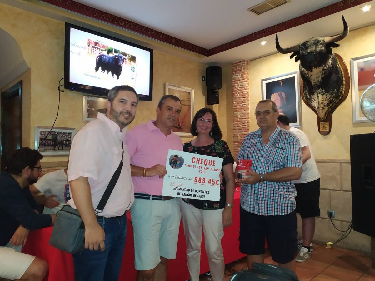 El pasado día 19 de julio, tuvo lugar en la cafetería Grana y Oro la entrega de un cheque simbólico con el importe obtenido por ... la venta de las chapas solidarias del grupo de Facebook 'Fans de los Sanjuanes' creado por la apasionada aficionada taurina Lola Gordo Sánchez y que ha ascendido a la cantidad de 989,45 euros.