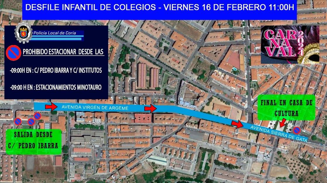 Con motivo del mismo, la Policia Local de Coria, ha informado de que se prohíbe estacionar desde las 09:00, en la calle Institutos y Pedro Ibarra, así como en los estacionamientos del minotauro.
