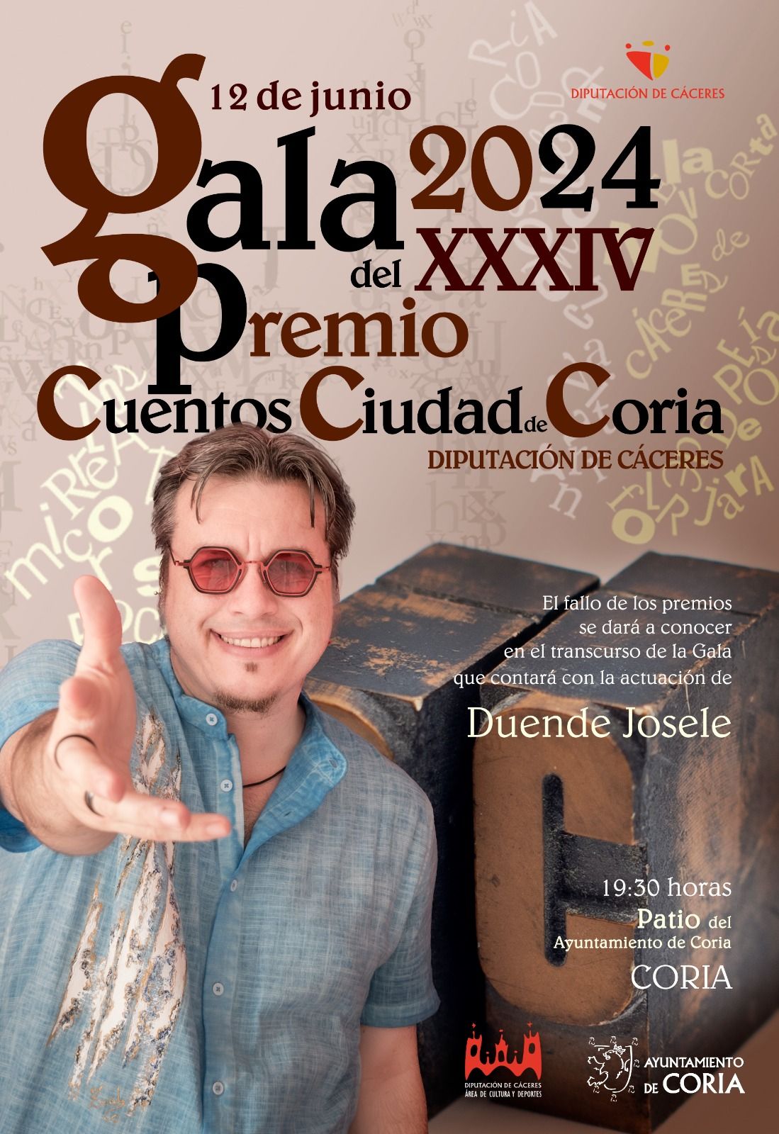 El jueves 12 de junio, a las 20:00 horas, en el patio del Ayuntamiento de Coria, se fallará el Premio de Cuentos Ciudad de Coria, con la actuación de Duende Josele, y al día siguiente, el jueves 13 de junio, a las 20:00 horas, en el Complejo Cultural San Francisco de Cáceres, será la gala en la que se darán a conocer el resto de ganadores. Una gala, presidida por el presidente de la Diputación de Cáceres, Miguel Ángel Morales, que contará con la poeta Yolanda Castaño como maestra de ceremonia, la actuación de Pepe Viyuela y de la Jazzeres Big Band.