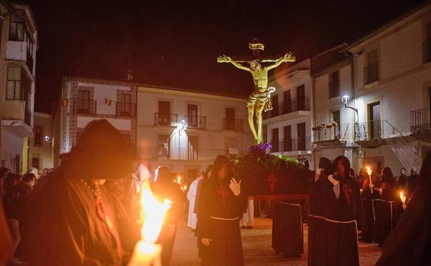 En el más recóndito silencio y sin música, solamente interrumpido por tres toques de tambor y esquila, discurre la procesión por el recinto amurallado, impresionando la salida del Crucificado por la puerta de la ciudad enfilando la calle Horno con la muralla romana como fondo y de frente el castillo de los Duques de Alba. Posteriormente el desfile procesional, donde siempre hay algún poeta que espontáneamente recita algunos versos al Crucificado y alguna saeta salida de lo más profundo del alma, el desfile procesional camina por las tortuosas y estrechas calles plagadas de historia. La procesión tiene su punto final en la plaza de España con el canto del miserere por todos los cofrades.