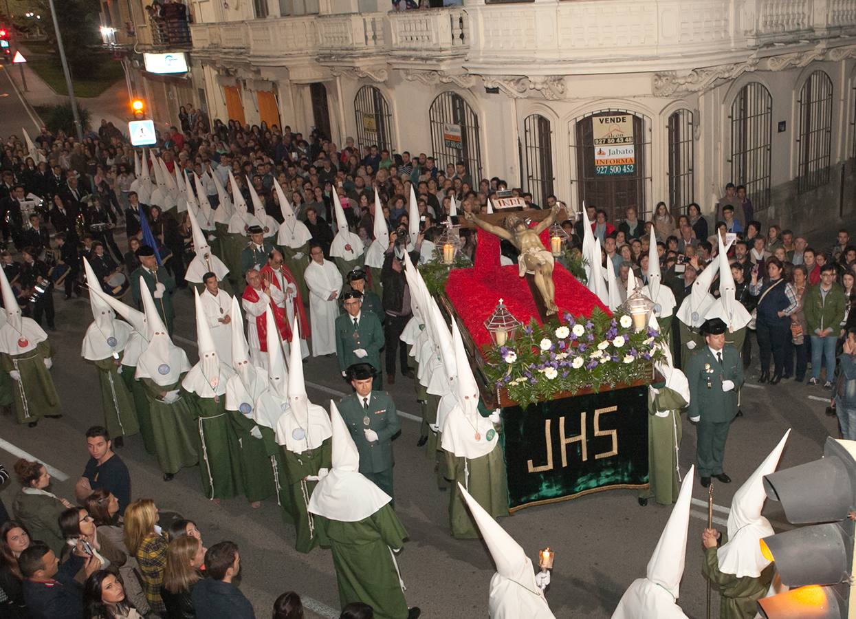 Durante el desfile penitencial, escoltando la imagen del Crucificado miembros de la Guardia Civil, largas filas de verdes túnicas y blancos capirotes, un gran número de cirios, armoniosos acordes de bandas, atronadores ritmos de tambores y desgarradores lamentos de saetas, acompañan, desde las amplias avenidas a los recónditos vericuetos de la ciudad antigua, a este Cristo de factura nueva pero ya de enraizada veneración. La cofradía realiza estación penitencial ante la Puerta del Evangelio de la Catedral. Impresiona también el silencio profundo de los cientos de devotos que presencian el desfile procesional o acompañan a este Crucificado en su lecho de claveles rojos. También el desfile procesional hace parada a las puertas del Hospital Ciudad de Coria para pedir por los enfermos hospitalizados.