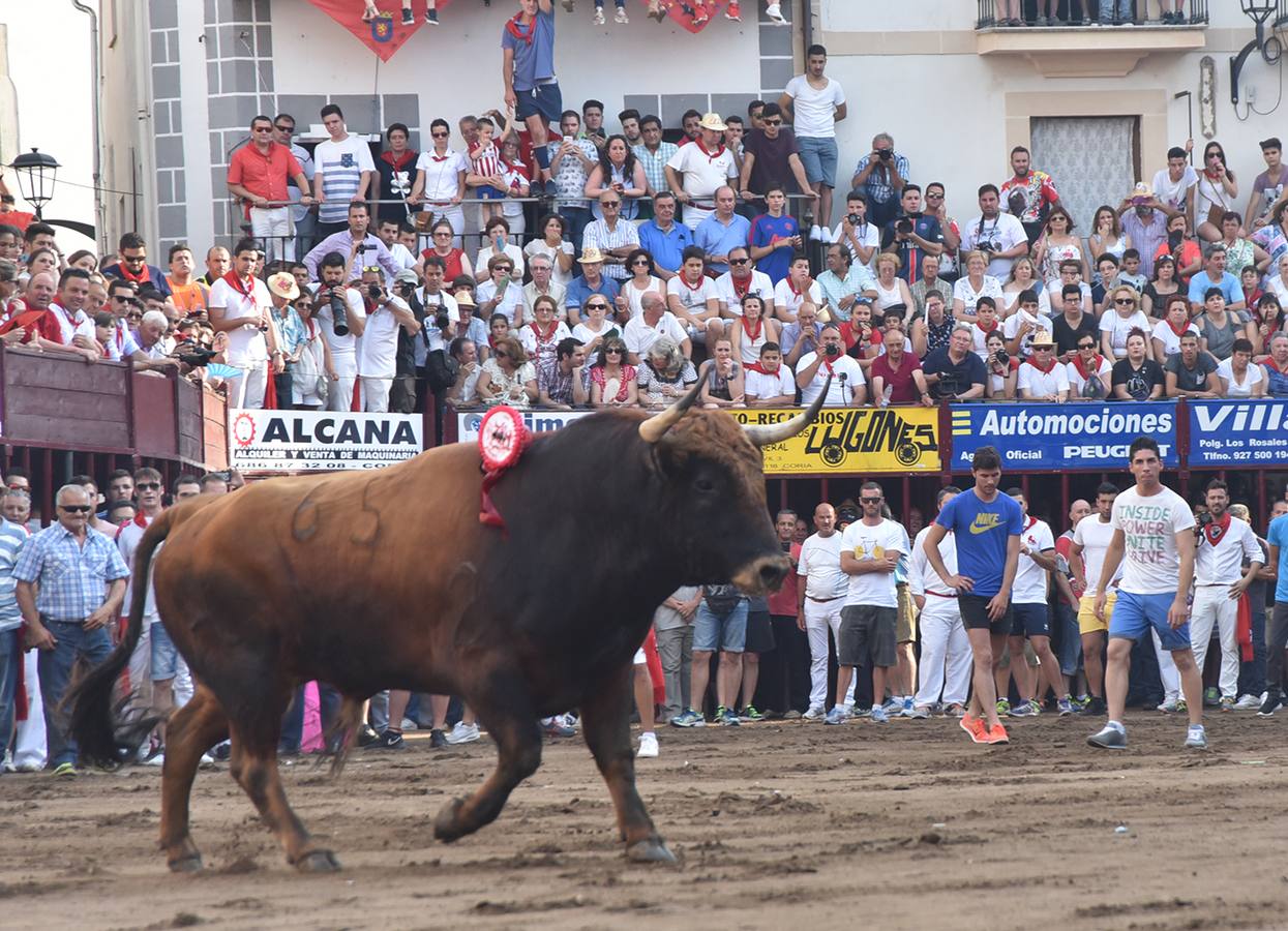 Una vez pasado el protocolo, se dio suelta al último toro de las fiestas, un toro castaño en negro, veleto con cara alta y afilados pitones, por nombre Malasangre y perteneciente a la ganadera cauriense Maricarmen Valiente, cuyo ganado pasta en la finca La Zarzuela del término municipal de Calzadilla.