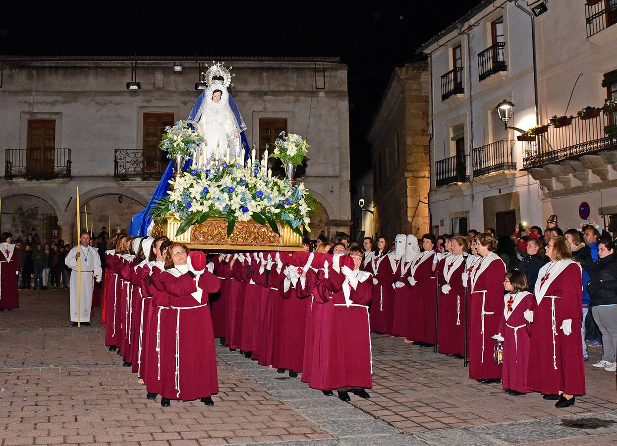 Merece contemplar esta procesión, mezcla de proclamaciones proféticas y de música festiva, con recogimiento y fervor. Tiene estética y mucha, y nada mejor que contemplar este desfile procesional por las calles del casco antiguo teniendo como telón de fondo la muralla romana, la plaza de la Cava con el Castillo de los duques de Alba, camino ya de la churrigueresca espadaña del templo parroquial de Santiago Apóstol. Destaca de este desfile procesional el canto de los siete dolores de la Virgen en siete paradas, finalizando el acto religioso con el canto de La Salve en la plaza de España.