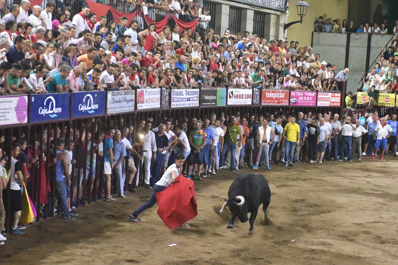 La salida a la plaza fue espectacular mostrando gran poderío el animal y realizando vertiginosas carreras, poniendo en aprietos a un recortador que estuvo a punto de sufrir un serio percance. Los maletillas se dieron cuenta de la bonanza del animal y con su muleta aprovecharon la ocasión que se les brindaba para darle pases de mucho mérito por el pitón derecho, lo que los aficionados supieron agradecer, aunque por dos veces dobló las manos en el remate de los pases. El toro dio una gran función en la plaza marcando bien los tiempos y cuando menos se esperaba salía como una centella en busca de los corredores. Cabe resaltar que recibió pocos recortes, motivo por el cual salió a las calles con mucha fuerza y frescura, haciendo su salida por la portona de la Cárcel Real, bajando por la calle de las Monjas hacia la plaza de San Pedro y siendo el toro ideal para las fiestas de Coria, pues el animal tuvo una lidia completa tanto en la Plaza como por las calles del recinto amurallado donde se le veía por todas partes. En resumen, apareció el gran toro que todos los aficionados desean y ojalá sea un buen augurio para el resto de las fiestas.