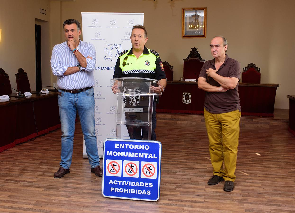 Por su parte, Joaquín Barrio Goñi, jefe de la Policía Local ha explicado que, «enmarcado en el fenómeno del vandalismo, entendido como acciones incívicas, ejecutadas contra el patrimonio tanto público como privado por personas e individuos aislados, hemos detectado que determinadas zonas monumentales, emblemáticas para Coria, están sufriendo daños provocados por el mal uso de artículos como patines, patinete o monopatín, hoy denominados skate, scooter y roller. Muchos usuarios de este tipo no lo utilizan como un medio de desplazamiento sino para competir y mostrar destrezas acrobáticas utilizando el mobiliario público creando graves daños».