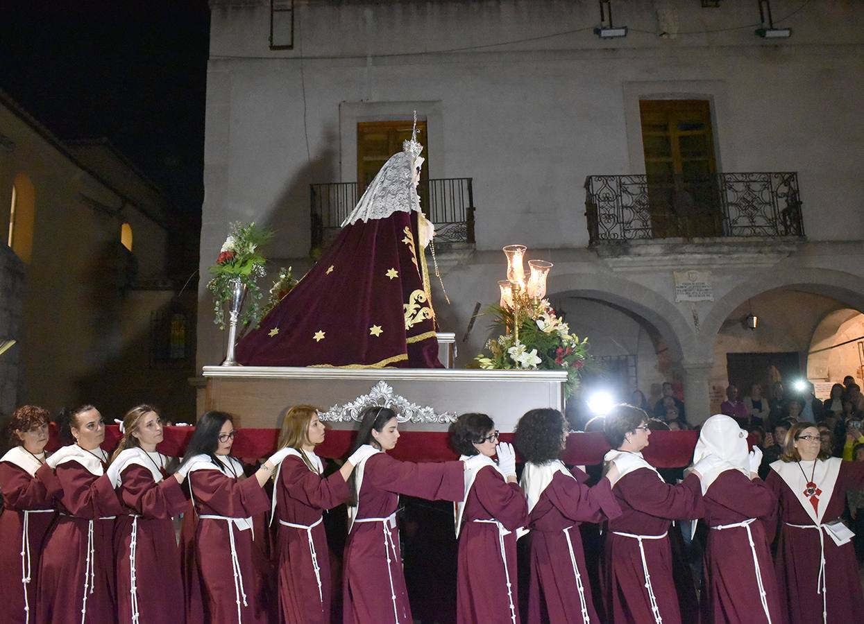 Esta cofradía está formada únicamente por mujeres que visten túnica de color granate con muceta blanca luciendo la Cruz de Santiago, guantes y cordón blanco, además de zapatos negros.