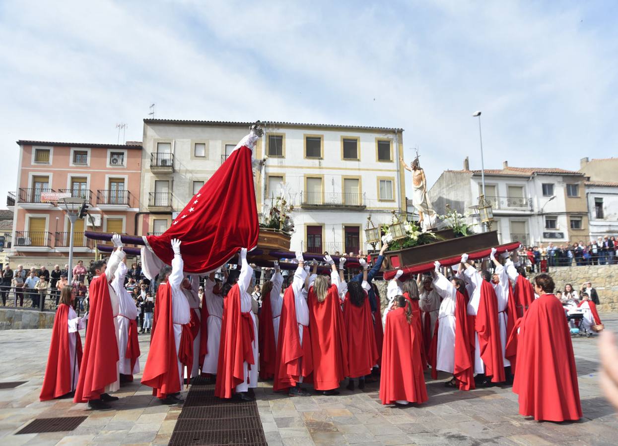 Las imágenes antes de encontrase, simulan saludos con tres inclinaciones. En el encuentro definitivo, hay vítores, aplausos y canto del Aleluya. Los cohetes y las campanas dan un toque de fiesta a este momento de emoción. La procesión tornará con ambas imágenes hacia la Catedral por el mismo trayecto que realizó la Virgen hasta la plaza de la Paz. Con entrada triunfal de ambas imágenes en el Primer Templo de la Diócesis. Seguidamente y en la Seo Cauriense, el obispo de la Diócesis, Francisco Cerro Chaves, oficiará Solemne Misa Pontifical de Pascua de Resurrección con Bendición Papal.