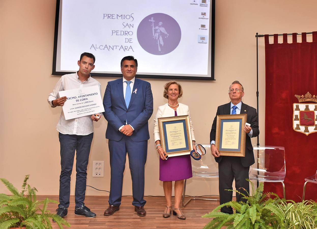 Un salón de plenos lleno brindó un sonoro y largo aplauso a Eladio Paniagua Simón y a Lali Clemente Fuentes, viuda de José Delgado Corrales - ... premiado a título póstumo-, que ayer recibieron el galardón San Pedro de Alcántara, patrón desde 1622 de Coria. También fue premiado como mejor deportista local no profesional Ramón Pintiado Lozano, destacado pescador. «Sois un ejemplo en el que nos podemos mirar y sacar buenas lecciones», dijo el alcalde de Coria, José Manuel García Ballesteros, sobre los reconocidos. Eladio Paniagua recitó versos propios y ajenos, recordó a amigos desaparecidos, se emocionó citando a su familia y subrayó su amor por el Club Deportivo Coria, del que es el socio número uno. Lali Clemente recordó en una emotiva intervención la figura de su marido, maestro como Paniagua pero muy vinculado al ámbito musical y a la catedral. La Coral Cauriense cerró el acto interpretando un himno compuesto por Delgado.