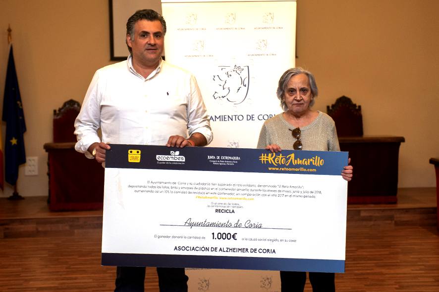 El alcalde de Coria, José Manuel García Ballestero, entregó ayer a la Asociación de Familiares de Enfermos de Alzhéimer el cheque de los 1.000 ... euros que ha recibido recientemente el Ayuntamiento en la campaña de reciclaje 'Reto Amarillo', desarrollada por la Consejería de Medio Ambiente junto con Ecoembes para aumentar el nivel de concienciación medioambiental de la ciudadanía. Rita Vivas, presidenta de la AFA-Coria, agradeció al Ayuntamiento y a la ciudad este premio. «Lo cogemos con ilusión después del bache que ha vivido el colectivo durante meses. Agradecemos la colaboración del ayuntamiento durante todo este tiempo». También agradeció Vivas Domínguez la colaboración de la Junta de Extremadura en la cesión directa de alrededor de 16.000 euros, aunque lo considera escaso y por este motivo la sede de la asociación ha permanecido cerrada durante siete meses.