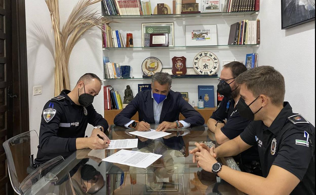 Julián se incorpora de manera oficial a su plaza por el procedimiento de movilidad. De esta manera, se ha celebrado el acto de la firma de contratación como funcionario de carrera en el despacho del alcalde con la presencia del primer edil, José Manuel García Ballestero y dos agentes de la policía local.