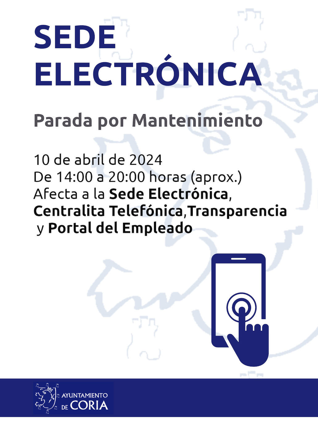 El Ayuntamiento de Coria informa que hoy 10 de abril de 2024 a las 14:00 horas se realizará una parada por mantenimiento(hasta las ... 20:00 horas aproximadamente).