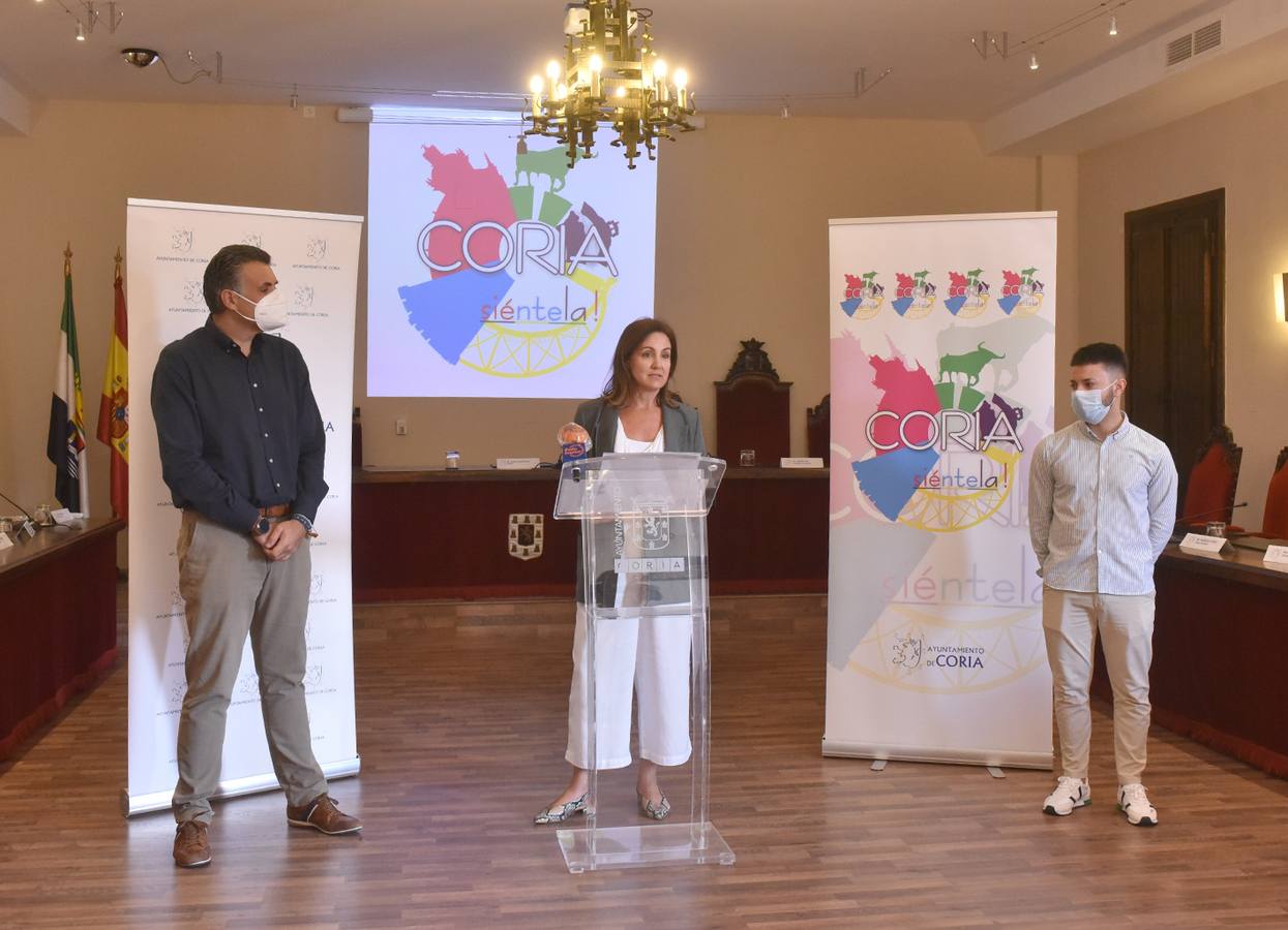 La edil de turismo del Ayuntamiento de Coria, Almudena Domingo Pirrongelli, manifestó que «hemos comenzado por darle un nuevo aire a la imagen del 'Coria Siéntela', que no solo se utilizará para comercio, sino para turismo y cualquier promoción de la propia ciudad». Una imagen, dijo, que identifica Coria con su Castillo (patrimonio), Puente Medieval (deporte y naturaleza), Catedral (cultura), Mantel de la Sagrada Cena (turismo religioso y gastronomía) y el toro de las Fiestas de San Juan. Se trata de una imagen estática y plana, dijo la edil de turismo, que hemos transformado en circular, como una rueda, como un engranaje, que simboliza el volver a andar. Es una imagen 360º, no hay turismo sin comercio, no hay comercio sin hostelería, no hay desarrollo sin empresas.