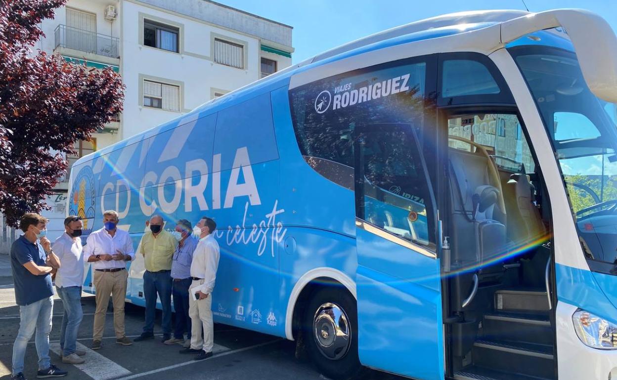 El alcalde de Coria, José Manuel García Ballestero, junto al concejal de Deportes, Juan Manuel Gutiérrez Rodríguez, ha acompañado en la mañana de este jueves al presidente del Club Deportivo Coria, Aurelio Gutiérrez Rodríguez, y miembros de la directiva, en la presentación oficial del autobús que trasladará a los jugadores del equipo cauriense a los partidos que disputará la próxima temporada en todo el territorio nacional.