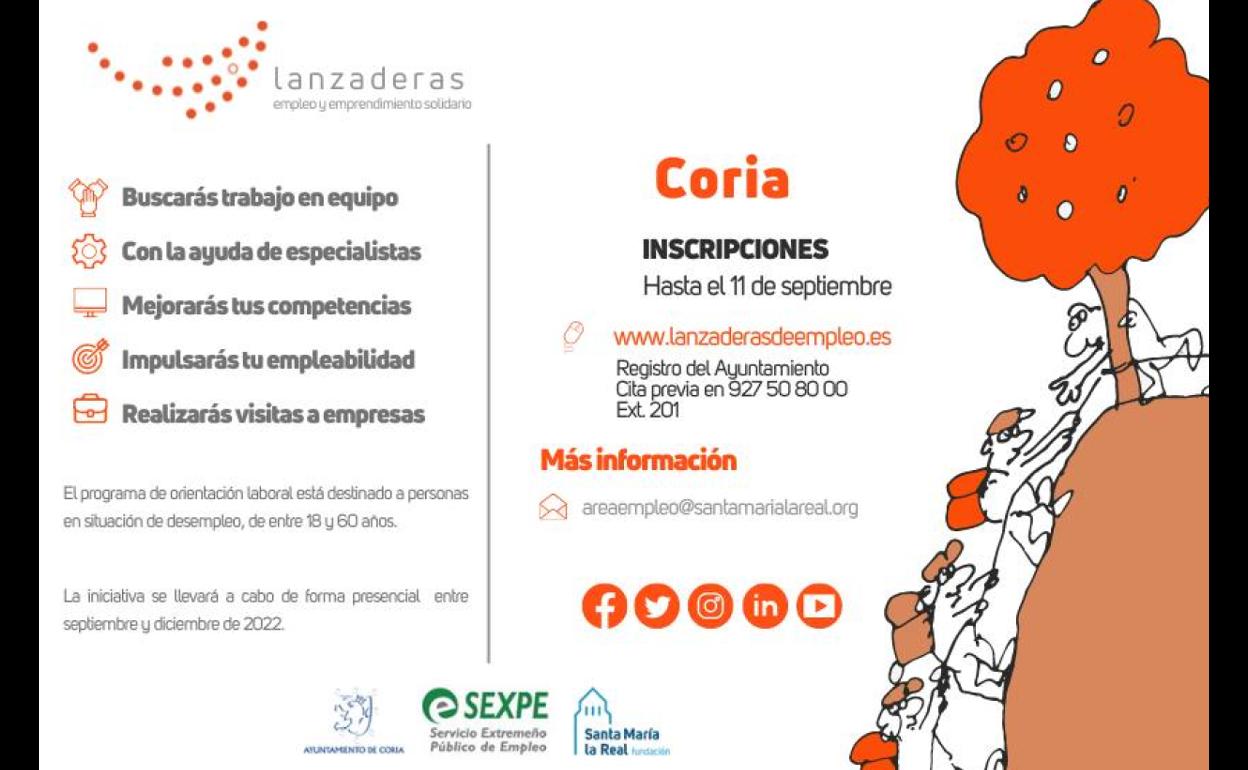 A partir de septiembre habrá en Coria una nueva Lanzadera de Empleo destinada a aquellas personas de entre 18 y 60 años que sean paradas y que quieran reactivar la búsqueda de empleo. Habrá un total de 20 plazas.
